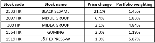 本月Solactive香港新股指數的十大持股出現變化,四月十大持股中的老鋪黃金(6181.HK)被剔出,而健康之路(2587.HK)則成為新的十大持股。目前Solactive香港新股指數佔比較重的行業包括: 非日常生活消費品(例如美的集團、蔚來汽車及零跑汽車)、資訊科技(例如地平線機器人、金山雲及速騰聚創)、和日常消費品(例如巨子生物、衛龍美味及毛戈平)。目前指數十大持股及板塊分佈如下圖: