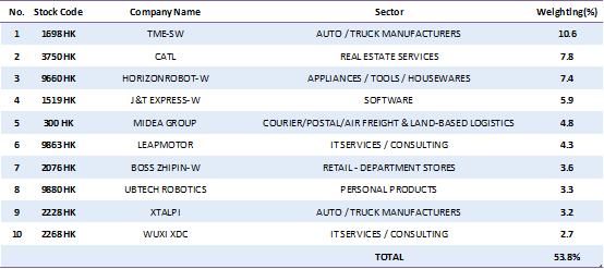 本月Solactive香港新股指數的十大持股出現變化,五月十大持股中的蔚來-SW(9866.HK)因上市時間超過三年所以在季度再平衡中被剔出,衛龍美味(9985.HK)和健康之路(2587.HK)也因市場波動跌出十大持股,而寧德時代(3750.HK)、蜜雪集團(2097.HK)、及越疆(2432.HK)則成為新的十大持股。目前Solactive香港新股指數佔比較重的行業包括: 非日常生活消費品(例如美的集團、零跑汽車及蜜雪集團)、工業(例如寧德時代、極兔速遞-W及越疆)和資訊科技(例如地平線機器人-W、金山雲及第四範式)。目前指數十大持股及板塊分佈如下圖: